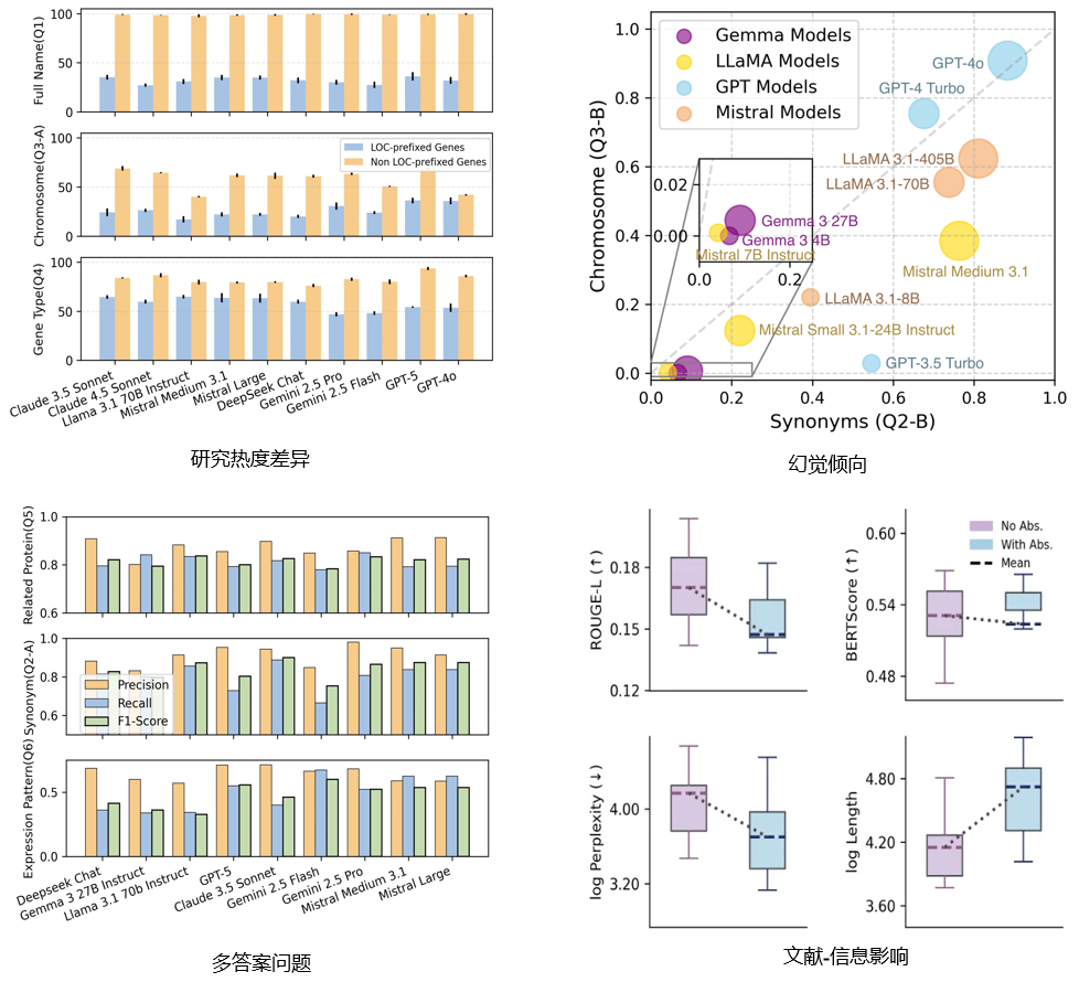 - 文献信息影响:提供基因相关文献摘要可降低困惑度,但可能导致回答语义偏离标注内容。