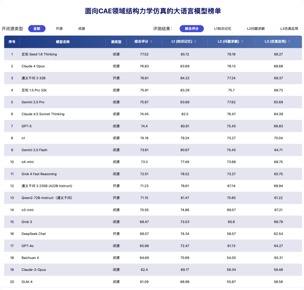 - L3(仿真应用) 排名出现分化: o1(70.04)在 L3 维度取得全榜最高分,通义千问3 235B(A22B Instruct,69.94)位列第二。该结果表明,综合排名靠前并不必然意味着在仿真应用(L3)维度同样领先。