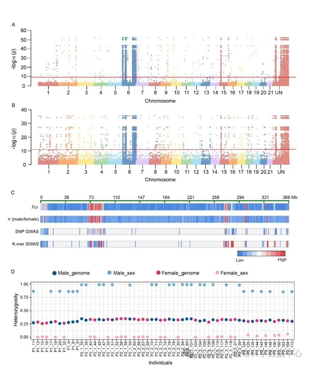 为探讨上述问题,汪小全研究团队利用已经测序的百岁兰基因组(约6.8 Gb),对该物种分布于纳米布沙漠南端地理距离很近的5个群体130个个体进行了全基因组重测序,开展了群体基因组比较和环境因子等综合分析(图1)。研究显示,基因组在这些群体间发生了显著分化,地理隔离是重要驱动力,其通过限制基因流直接导致了谱系间的遗传分化,环境因素(尤其是土壤异质性)在群体分化中也具有重要作用。同时,百岁兰以虫媒传粉为主、传粉动物的飞行力弱,并靠水力协助扩散种子。这些特性也限制了群体间的基因交流,加强了群体间遗传分化。基因组变异检测发现,群体间的基因组分化景观呈现高度异质性,基因组岛屿广泛分布于整个基因组,这主要归因于祖先多态的差异分选和搭车效应。此外,通过对30株雄性和30株雌性百岁兰个体的全基因组关联分析,研究人员发现其性别决定系统为XY型,性别连锁区域位于6号染色体的72.04-92.82 Mb(图2)。有趣的是,在该区域中并未发现已知在其他裸子植物(如苏铁、银杏)性别决定中起关键作用的MADS-box基因家族成员。百岁兰科的XY型性别决定系统这一发现,结合基部裸子植物类群(苏铁、银杏)同样为XY型性别决定系统等证据,暗示着裸子植物的共同祖先可能是XY型性别决定系统。