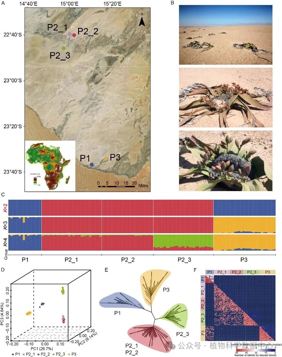 图1 百岁兰的采样地点、生境、形态和群体遗传结构