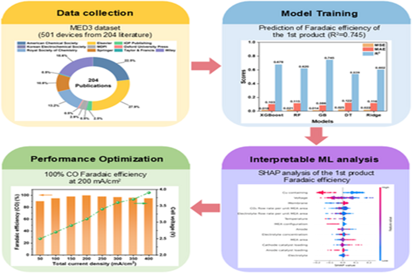 近日,国家基础学科公共科学数据中心信息科学分中心团队联合国家纳米科学中心、北京科技大学团队,在人工智能辅助用于CO2电解的膜电极(MEA)器件设计方面取得突破,相关成果以“Integrating Machine Learning Insights in Membrane Electrode Assembly for CO2 Electrolysis”为题在材料领域国际期刊《Advanced Functional Materials》上发表,期刊影响因子19.4。论文的共同第一作者为信息科学分中心团队硕士研究生王海丹,共同通讯作者为信息科学分中心负责人杜一研究员。