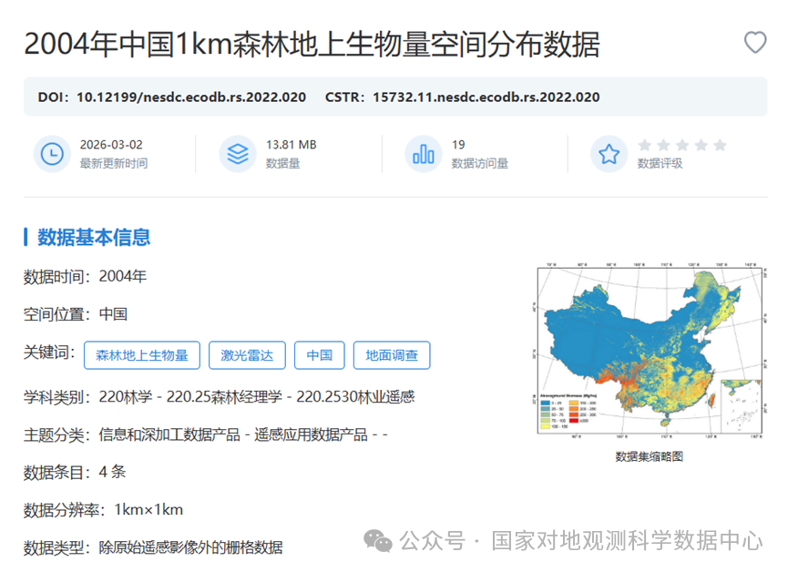 由北京大学郭庆华老师团队提交的“2004年中国1km森林地上生物量空间分布数据”,经审核整理后正式在国家对地观测科学数据中心发布,热忱欢迎广大科研工作者关注并使用该数据集。