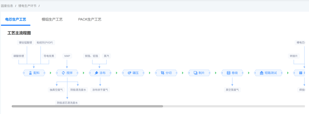 系统呈现电池生产(电芯、模组、Pack)与回收(三元、磷酸铁锂不同工艺)全链条的固体废物产生清单与特性;