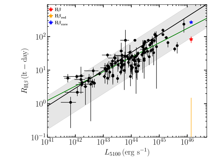 图1:R-L关系。黑线为 M. C. Bentz 等(2013)给出的最佳拟合关系;阴影区表示该关系预测半径的0.2-2倍范围。圆点为 S. Wang 与 J.-H. Woo(2024)样本中的数据,绿色曲线为其最佳拟合结果。彩色星形符号为研究人员对E1821+643的测量:红色星表示基于整体Hβ得到的结果,橙色星表示红移成分,蓝色星表示正常成分。