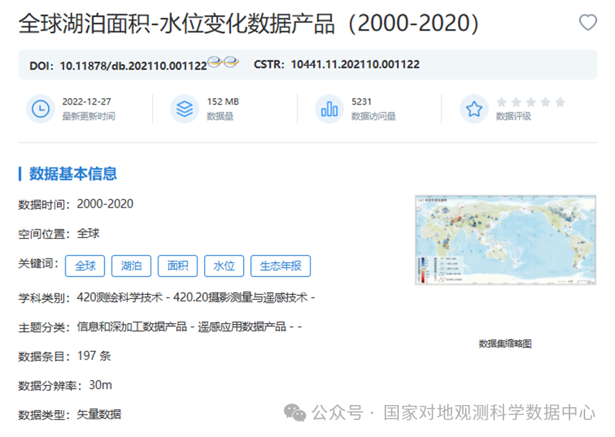 由中国科学院南京地理与湖泊研究所宋春桥老师团队提交的“全球湖泊面积-水位变化数据产品(2000-2020)”,经审核整理后正式在国家对地观测科学数据中心发布,热忱欢迎广大科研工作者关注并使用该数据集。