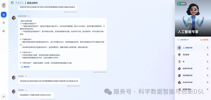 动态团队配置:系统会根据输入的课题需求,灵活组建跨领域的专家团队。